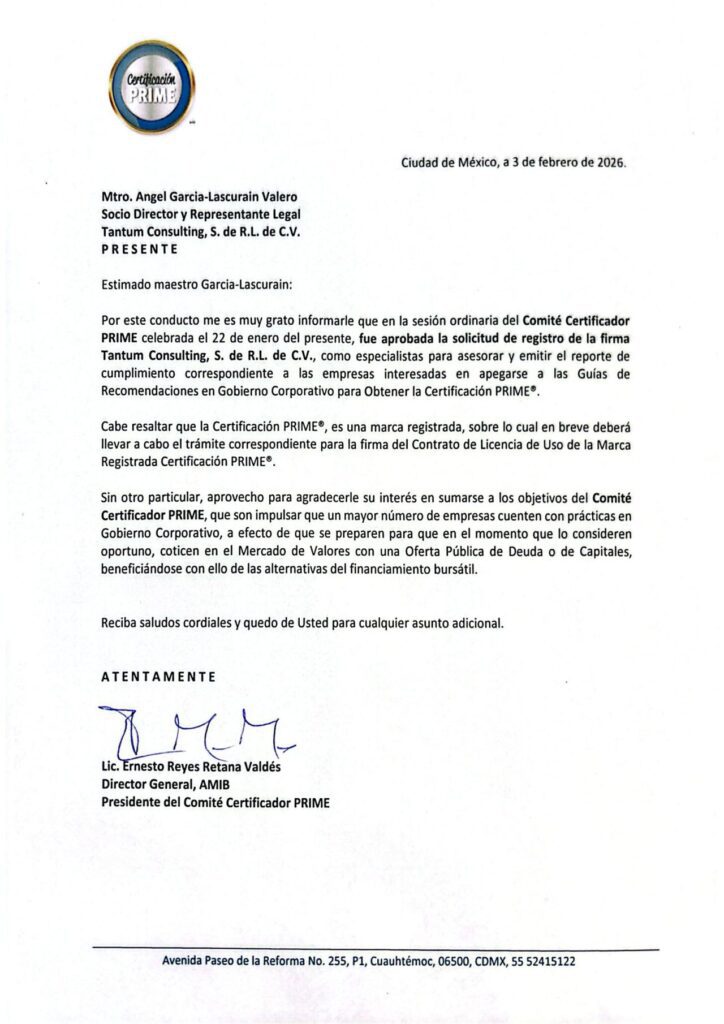 Tantum Consulting ha sido nombrado despacho autorizado para emitir el Reporte de Cumplimiento requerido para la obtención de la Certificación PRIME, conforme a los lineamientos del Comité Certificador PRIME.